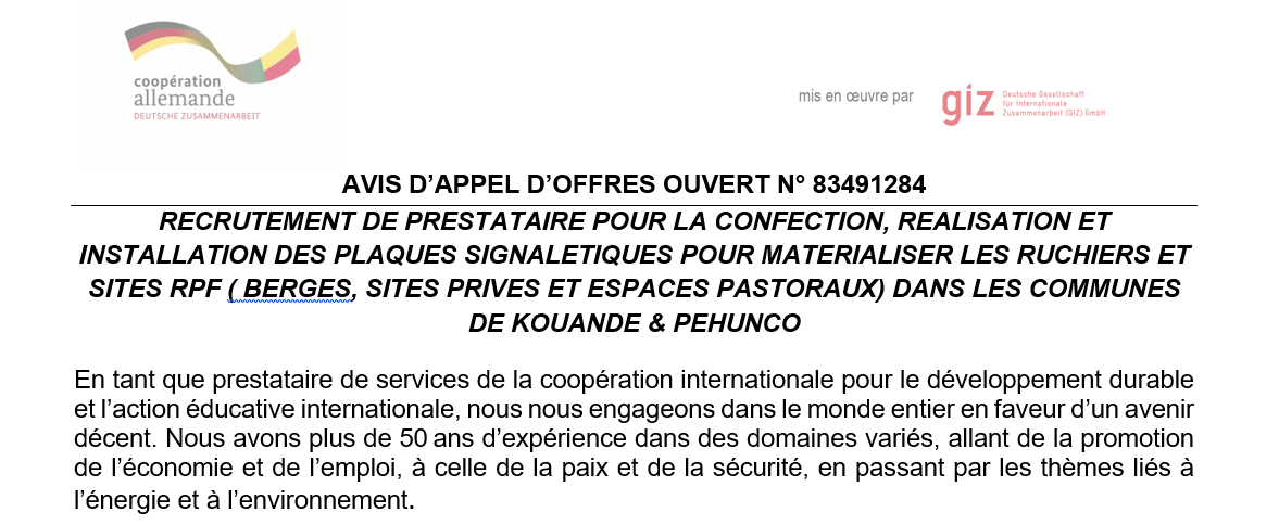 AVIS D’APPEL D’OFFRES OUVERT N° 83491284 : RECRUTEMENT DE PRESTATAIRE POUR LA CONFECTION, REALISATION ET INSTALLATION DES PLAQUES SIGNALETIQUES POUR MATERIALISER LES RUCHIERS ET SITES RPF ( BERGES, SITES PRIVES ET ESPACES PASTORAUX) DANS LES COMMUNES DE KOUANDE & PEHUNCO