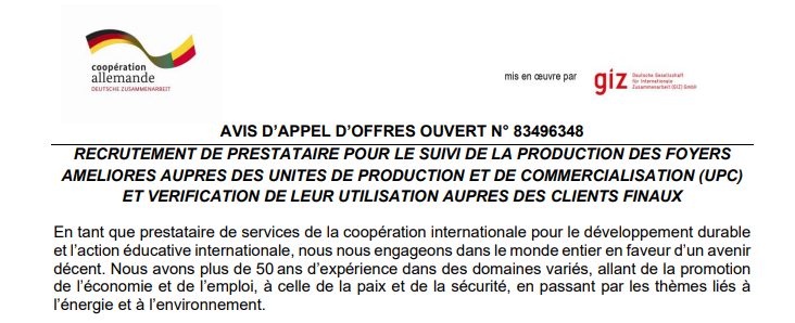 RECRUTEMENT DE PRESTATAIRE POUR LE SUIVI DE LA PRODUCTION DES FOYERS