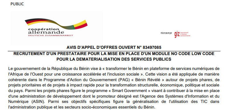 La GIZ recrute un prestataire pour la dématérialisation des services publics (AVIS D’APPEL D’OFFRES OUVERT N° 83497085)