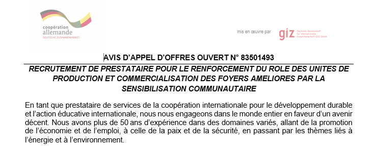 AVIS D’APPEL D’OFFRES OUVERT N° 83501493 : RECRUTEMENT DE PRESTATAIRE POUR LE RENFORCEMENT DU ROLE DES UNITES DE PRODUCTION ET COMMERCIALISATION DES FOYERS AMELIORES PAR LA SENSIBILISATION COMMUNAUTAIRE