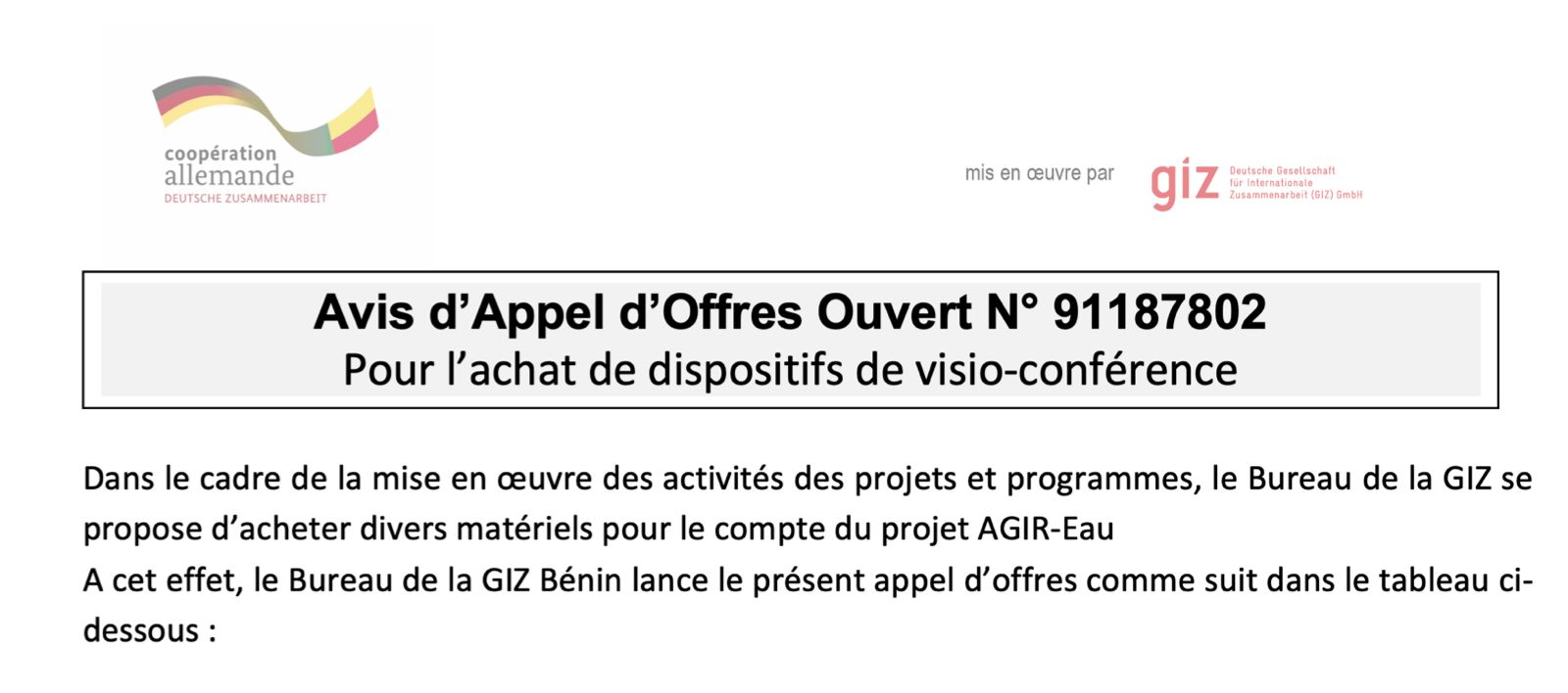 Avis d’Appel d’Offres Ouvert de la GIZ pour l’achat de dispositifs de visio-conférence Avis et appels d'offresUnes By LeMondeLocal Last updated Mai 19, 2025 0 1 325 Share Avis d’Appel d’Offres Ouvert pour l’achat de dispositifs de visio-conférence 19.05.2025 Avis d’appel d’offres DAO 91187802 Related Posts Voici pourquoi il faut voter UPR et Luc ATROKPO à Cotonou Cotonou sous Luc Sètondji ATROKPO, une plateforme de diplomatie… Voici le bilan de Luc Sètondji ATROKPO à Cotonou de 2020 à 2025 Partager : Cliquer pour partager sur X(ouvre dans une nouvelle fenêtre) X Cliquez pour partager sur Facebook(ouvre dans une nouvelle fenêtre) Facebook Similaire Avis d'appel d'offre GIZAvis d’Appel d’Offres Ouvert pour l’achat de dispositifs de visio-conférence 0 1 325 Share
