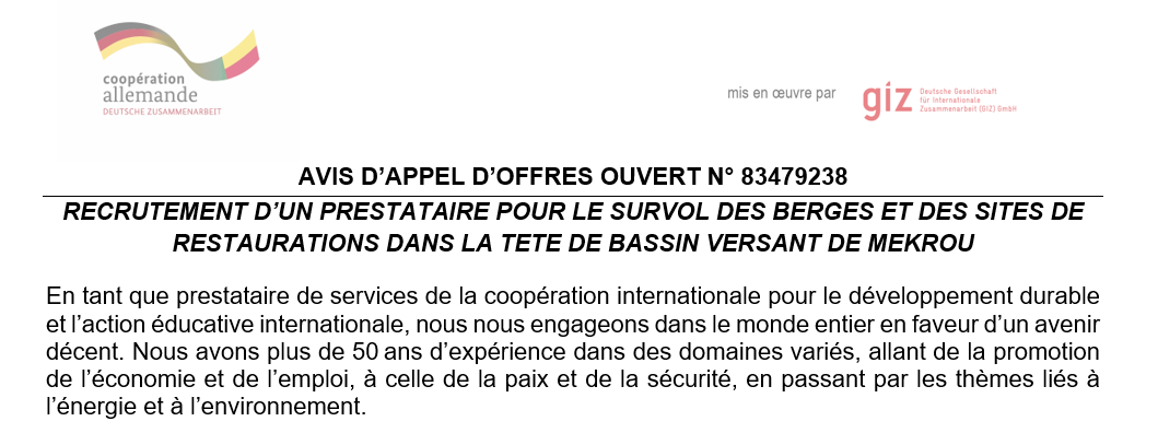 AVIS D’APPEL D’OFFRES OUVERT N° 83479238 PRESTATAIRE POUR LE SURVOL DES BERGES… Avis et appels d'offresUnes By LeMondeLocal Last updated Déc 6, 2024 0 726 Share Le lien pour l’appel d’offres : 83479238_Avis d'Appel d'Offres Related Posts Le Chef de l’Etat rencontre les préfets avant… Les conseils communaux et municipaux installés cette semaine, les… Totalité des résultats des communales du 11 janvier 2026 Partager : Cliquer pour partager sur X(ouvre dans une nouvelle fenêtre) X Cliquez pour partager sur Facebook(ouvre dans une nouvelle fenêtre) Facebook Similaire Avis d'appel d'offre GIZBénincollectivités localesCommuneGIZ 0 726 Share