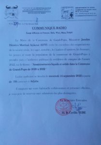 Dans le cadre de l’organisation de l’audience publique de reddition de compte de l’année 2022, sur le thème ‘’Assainissement liquide et solide dans la Commune de Grand-Popo de 2020 à 2022 ’’, le maire de ladite commune par la voix d’un communiqué, invite les populations de Grand Popo prendre part à cette séance qui se déroulera le mercredi 14 septembre 2022 à 9h à Adjaha.