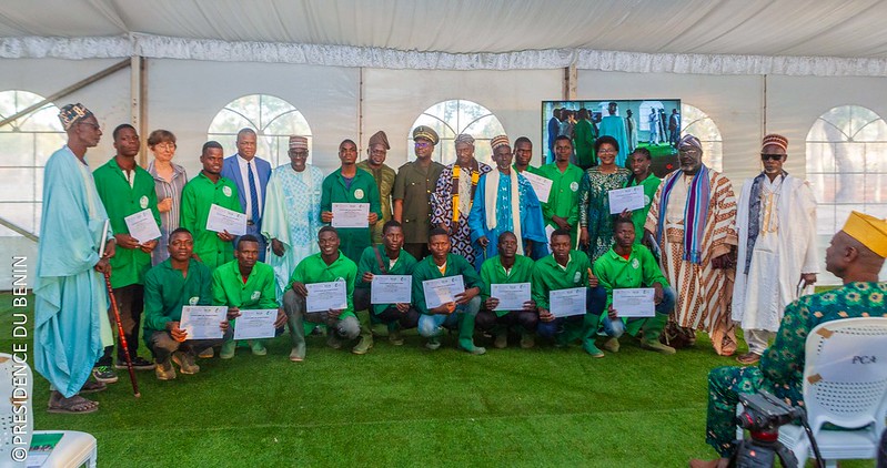 Créé en 2022, la première cohorte de 45 étudiants ont terminé leur formation professionnelle à l’IUEP-MA de Djougou. « C’est une formation d’un type nouveau où il y a au moins 70% de pratique. C’est une formation qui existe grâce à notre ferme, l’unité d’application. Les jeunes qui viennent dans cette formation passent 2 années. C’est une formation vraiment conçue autour de la construction du futur métier d’exploitant agricole entrepreneur » a indiqué Anne FLOQUET, Directrice du Centre Universitaire d’Enseignement Professionnel. La Ministre Éléonore YAYI LADEKAN a, quant à elle, réitéré la volonté du Gouvernement de tout mettre en œuvre pour que les jeunes formés soient reversés, sans attendre, sur le marché du travail. « Nous ne sommes pas en train de mettre sur le marché des nouveaux bébés. Les agripreneurs sont des soldats. Le Gouvernement fera tout pour vous donner les outils nécessaires qui vont vous permettre de vous lancer comme il se doit. Je voudrais vous souhaiter d’être de très bons ambassadeurs » a-telle-rassuré. Pour le Ministre Kouaro Yves CHABI « …ce qui se fait ici à l’IUEP-MA de Djougou est d’une importance capitale. Chers lauréats, il n’y aura pas de chômeurs parmi vous. Le Gouvernement y veille » confiera-t-il à la suite de sa collègue de l’enseignement supérieur. La cérémonie de lancement des activités académiques (deuxième promotion) de l’IUEP-MA de Djougou s’est achevée par la remise de diplômes aux 45 étudiants de la première promotion et le dévoilement de la plaque inaugurale.