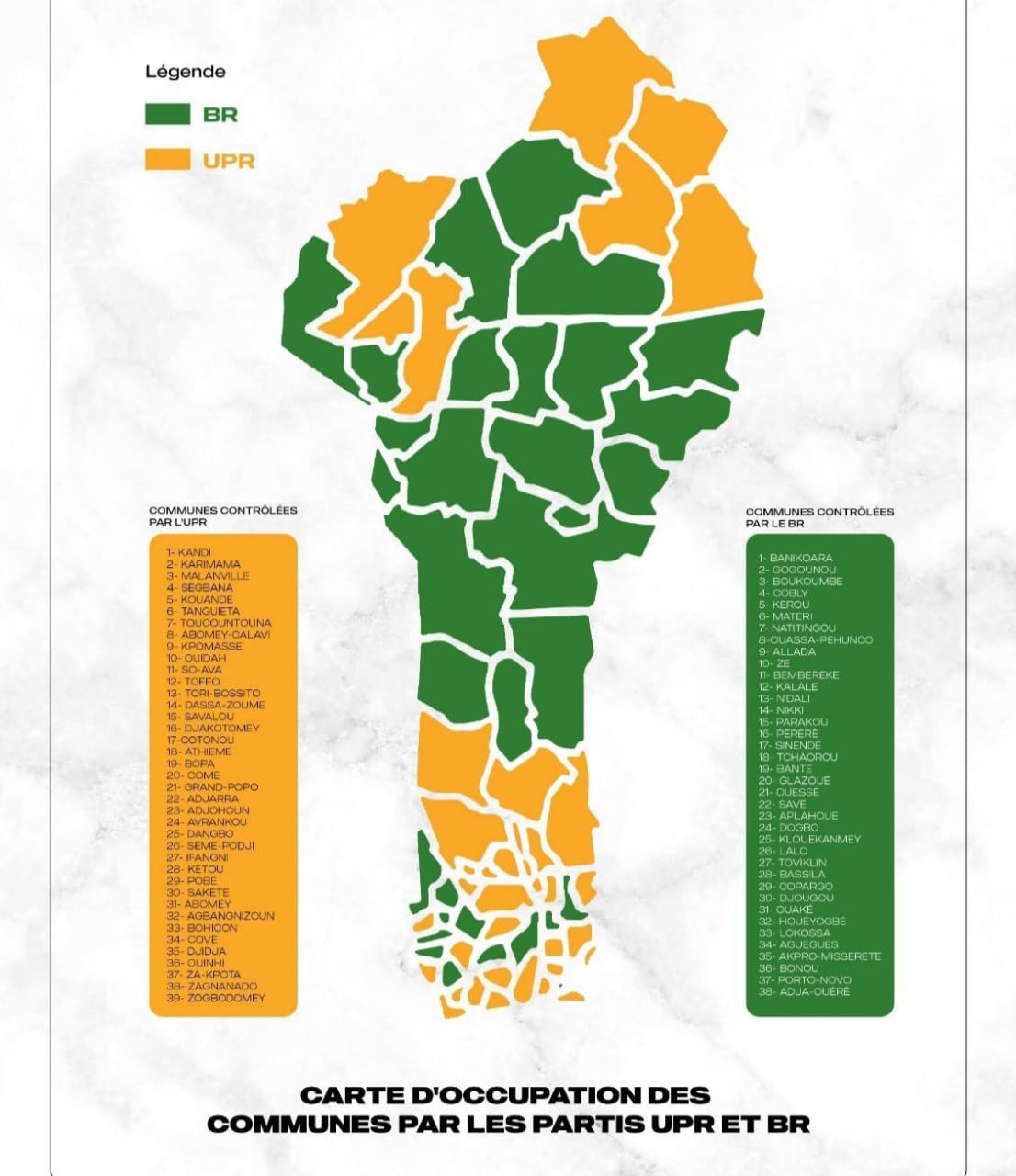 Ce double leadership des partis de la majorité présidentielle traduit une domination territoriale quasi-totale, confirmée par une répartition presque équilibrée des mairies : l’UPR contrôle 39 communes, tandis que le BR en dirige 38.