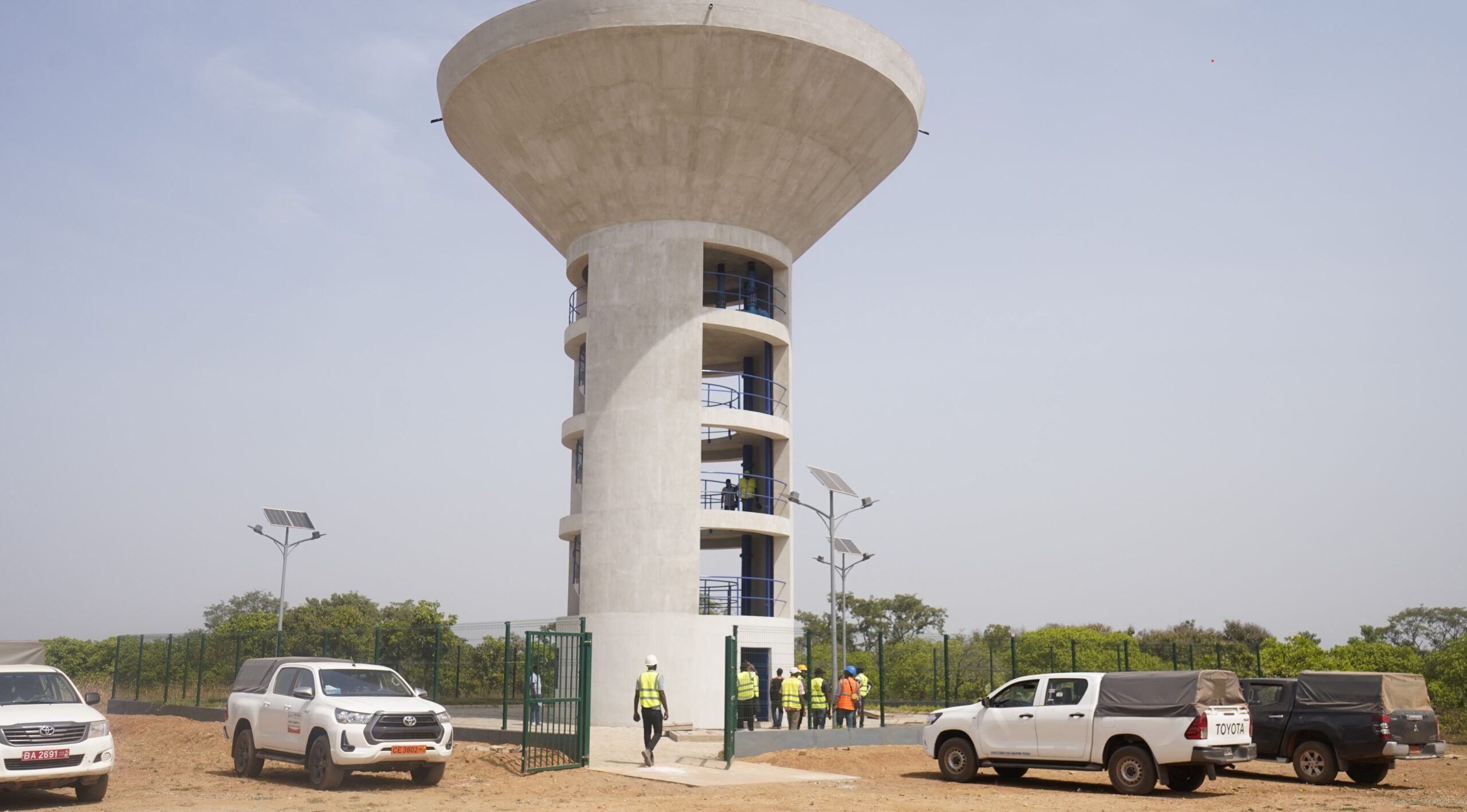 L’eau est acheminée vers un château d’eau de 400 m³, implanté à Galouzi, dans le village de Korowi, avec une hauteur sous cuve de 24 mètres. L’ouvrage est équipé d’une tuyauterie en fonte DN 300 mm pour l’arrivée et le départ de l’eau, d’une vanne hydro-altimétrique de 300 mm et d’une clôture de sécurité.