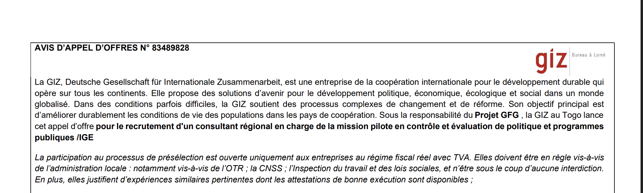 Pour accéder à l’AVIS D’APPEL D’OFFRES N° 83489828 pour le recrutement d’un consultant régional en charge de la mission pilote en contrôle et évaluation de politique et programmes publiques /IGE