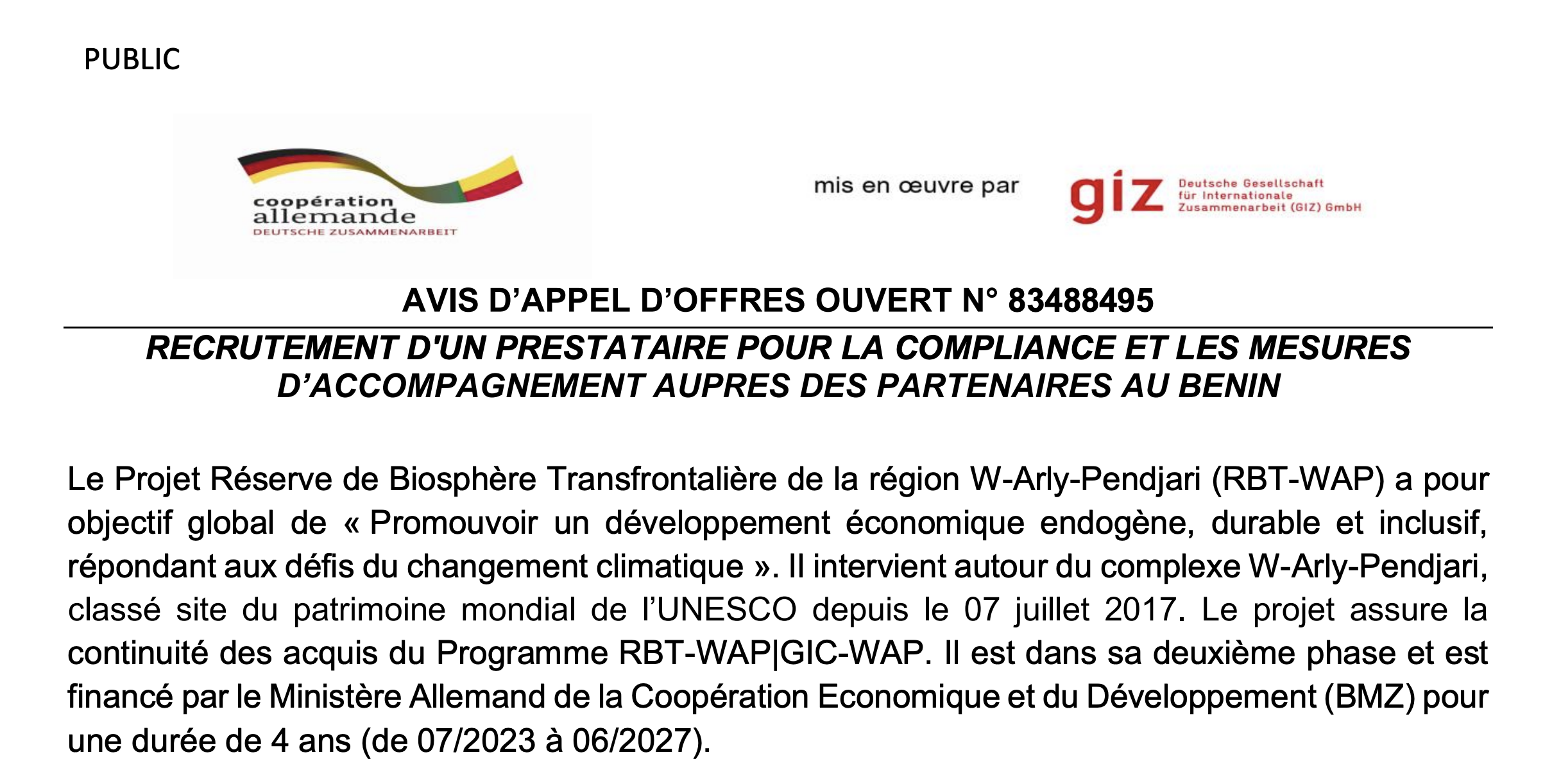 LA GIZ RECRUTE UN PRESTATAIRE POUR LA COMPLIANCE ET LES MESURES D’ACCOMPAGNEMENT AUPRES DES PARTENAIRES AU BENIN