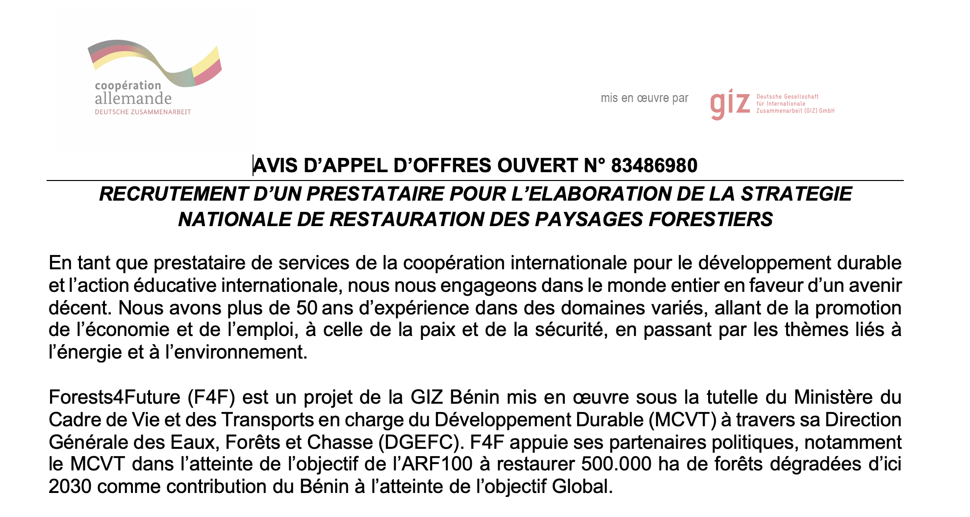 AVIS D’APPEL D’OFFRES OUVERT N° 83486980 POUR LE RECRUTEMENT D’UN PRESTATAIRE POUR L’ELABORATION DE LA STRATEGIE NATIONALE DE RESTAURATION DES PAYSAGES FORESTIERS