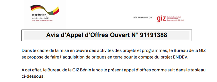 20.10.2025 002 GIZ Avis d'appel d'offres ENDEV 91191388Avis d’Appel d’Offres Ouvert N° 91191388» Acquisition de briques en terre pour le compte du projet ENDEV