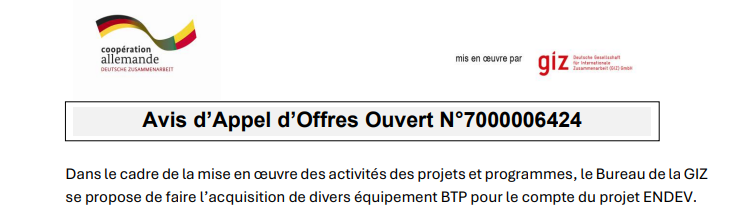21.04.2026 GIZ Avis d'appel d'offres ENDEV 7000006424Avis d’Appel d’Offres Ouvert N°7000006424 : acquisition de divers équipements BTP pour le compte du projet ENDEV.