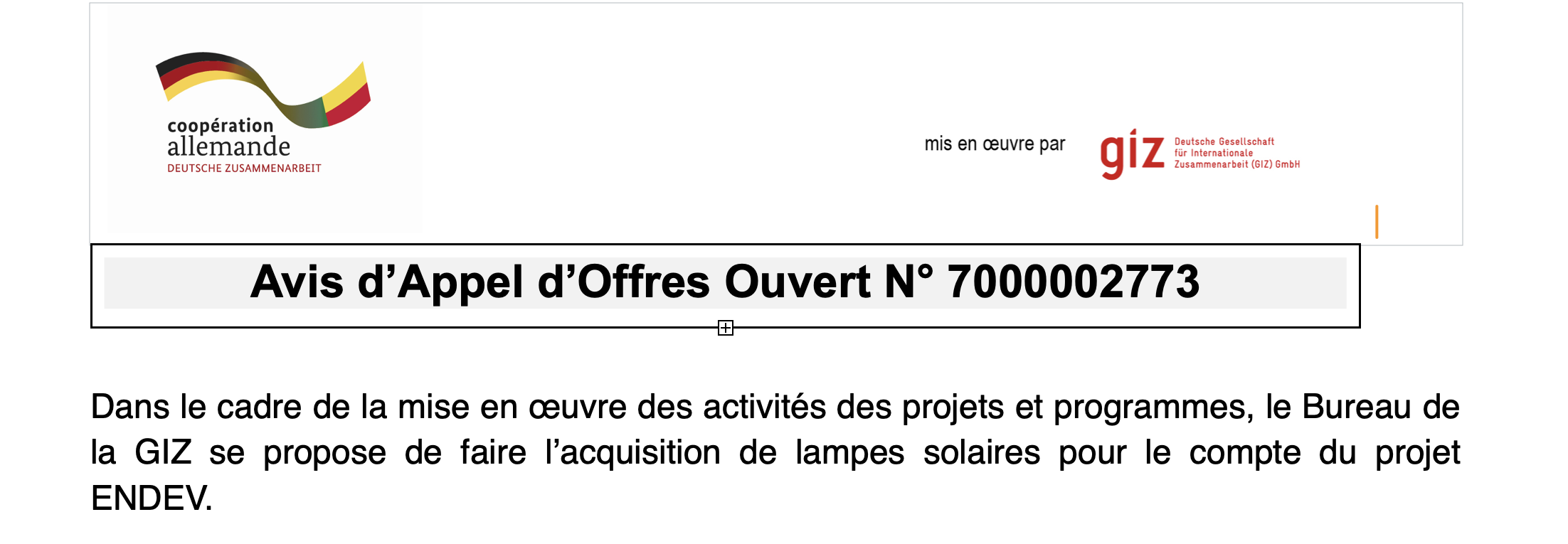 La GIZ veut acquérir des lampes solaires Avis d’Appel d’Offres Ouvert N° 7000002773 Avis et appels d'offresNon classé By LeMondeLocal Last updated Mar 12, 2026 0 82 Share Pour consulter l’Avis d’Appel d’Offres Ouvert N° 7000002773, cliquez sur le lien suivant : 1. Avis 7000002773 Related Posts La GIZ veut acquérir des foyers améliorés Une guerre préventive contre l’Iran pour éviter un désastre… L’UPR outille les maires et adjoints des communes qu’il contrôle Partager : Cliquer pour partager sur X(ouvre dans une nouvelle fenêtre) X Cliquez pour partager sur Facebook(ouvre dans une nouvelle fenêtre) Facebook Similaire Avis d'appel d'offre GIZEnDevGIZSolaire 0 82 Share
