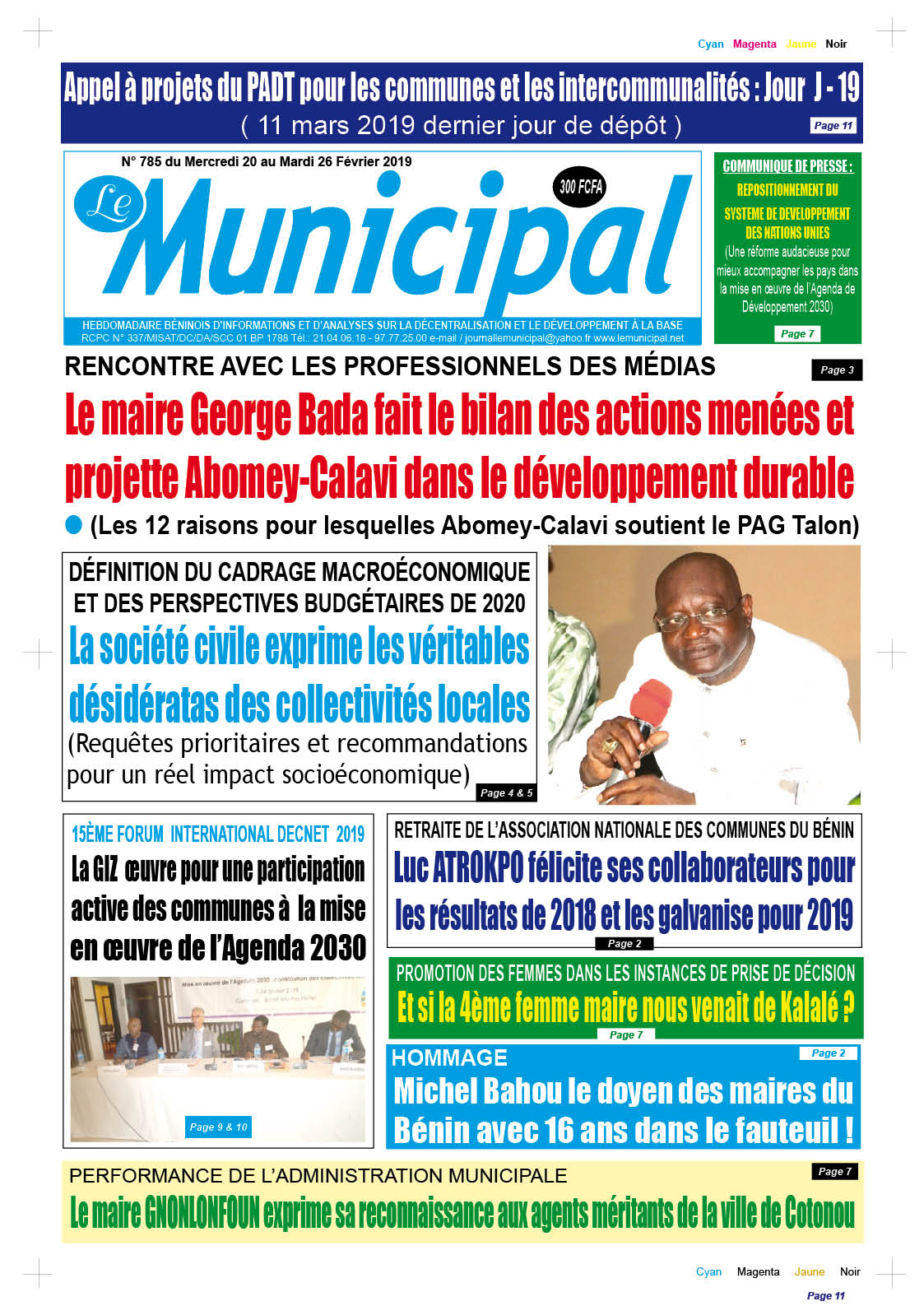 La UNE du journal Le Municipal qui revient sur l’appel à projets du PADT pour les communes (Jour J-19), le maire d’Abomey-Calavi qui fait le bilan des réalisations et projette sa commune dans le développement durable, les activités de l’ANCB, la possibilité d’avoir une 4ème femme maire à Kalalé, les activités du maire de Cotonou et vous révèle le doyen des maires du Bénin avec 16 ans d’exercice. Qui dévine de quel maire il s’agit? A découvrir dans le journal Le Municipal et sur www.lemondelocal.com