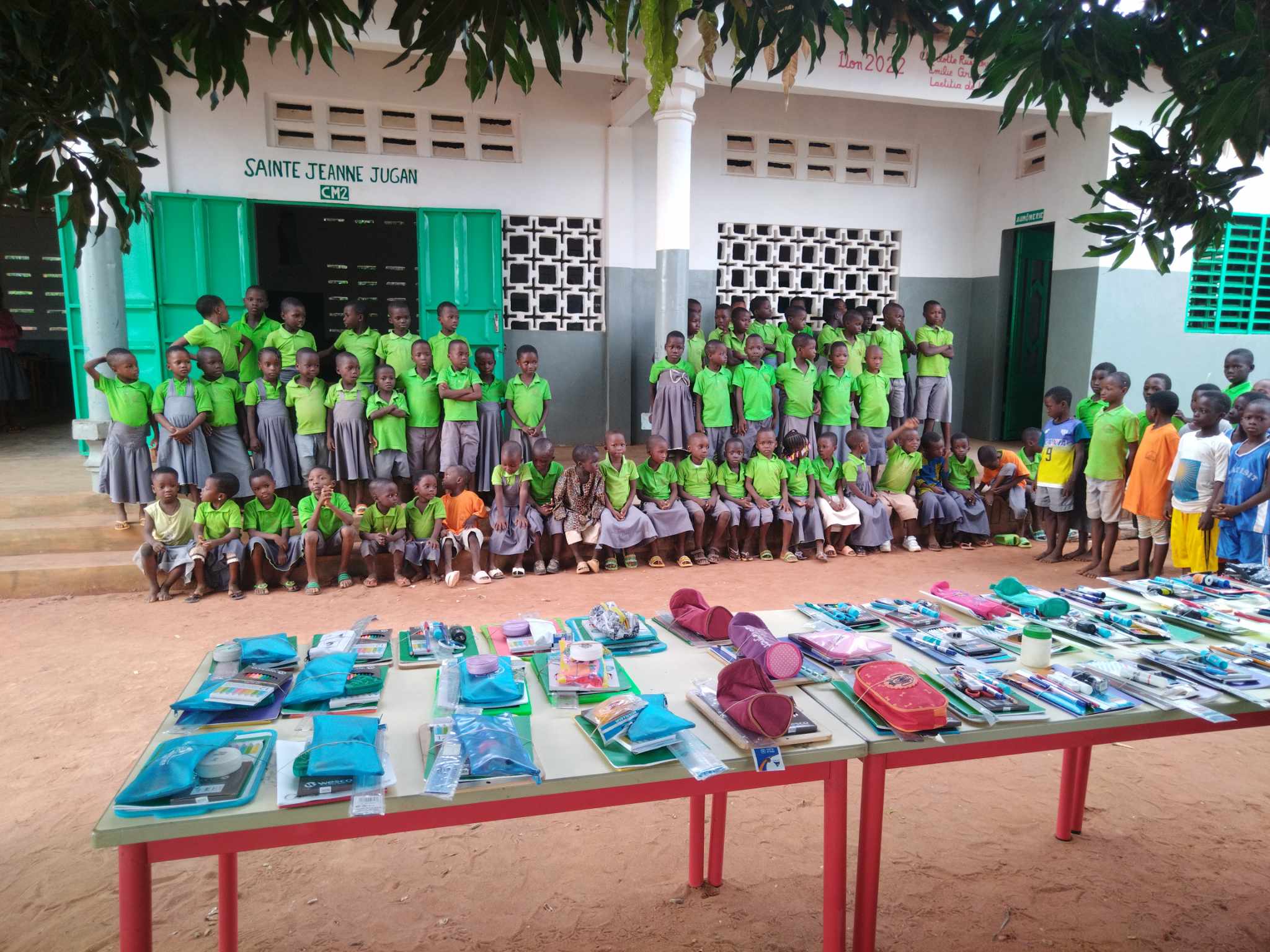 Sensible et dévouée pour l’avenir des enfants des milieux enclavés, Emmanuelle Monot, de la France, depuis 2018 n’en démord pas pour l’amélioration des conditions d’études des élèves de l’école catholique St Pierre et Paul de Goutchon. Village enclavé de l’arrondissement Agondji commune de Djidja. Depuis la création de ladite école en 2018, Emmanuelle Monot, grâce aux divers dons de son association appelée Espera et ses partenaires donateurs, à chaque rentrée des classes ne cesse de surprendre généreusement les élèves en descendant au Bénin avec plusieurs kits scolaires et le nécessaire pour le développement de ladite école. Cette année, elle est descendue au Bénin et a fait la joie de ces élèves avec des mobiliers (tables et chaises) offerts par des écoles françaises partenaires telles que Ste Geneviève d’Asnières et Notre dame de joie de Meudon et des kits scolaires aux élèves méritant.