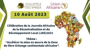 Le 10 août de chaque année, les Etats membres de l’Union Africaine (UA) célèbrent la décentralisation. C’est une tradition bien établie que le thème de la Journée Africaine de la Décentralisation et du développement Local (JAD) soit aligné sur le thème de l’année de L’Union africaine. Le thème de la Journée Africaine de la Décentralisation et du développement Local choisi pour 2023 est: “La contribution des Collectivités infra-nationales et locales d’Afrique au développement de la Zone de libre-échange continentale africaine “.