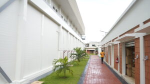 À ces composantes s’ajoutent des aménagements de voirie et réseaux divers d’une importance capitale. Le site bénéficie de voies de circulation intérieure, d’un accès principal et d’un accès secondaire, de parkings, d’ouvrages d’assainissement, d’une clôture neuve, d’espaces verts et d’un éclairage public alimenté par lampadaires photovoltaïques. Une voie en pavés relie en outre le domaine aux axes desservant le Centre International Hospitalier de Calavi (CHIC) et l’hôpital de zone de Calavi, ce qui renforce l’accessibilité et l’intégration du laboratoire dans son environnement institutionnel.